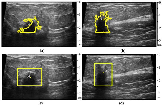 Figure 9a,b show the results of the contour segmentation outcomes (yellow line), with the upper hemisphere of the lesion highlighted by white lines. Figure 9c,d show the contours of the lesion outlined by the specialist physician (red line).