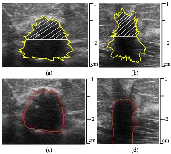 The ultrasound beam is emitted by the transducer, whose surface corresponds to the upper border of the ultrasound image. Then, the ultrasound passes through the tissues vertically downwards and reflects in the opposite direction. These reflected echoes form the basis of the high-quality ultrasound image with complete data, which is typical of the upper lesion hemisphere. In contrast, some ultrasound may reflect from the side lesion borders; however, a part of the reflected beam in this case passes under the variable angles to the vertical, missing the transducer. In some cases, when the lesion tissue absorbs the ultrasound, it produces very little or no echo. This phenomenon corresponds to the acoustic shadow (vertical black stripe) in Figure 9b. This means that this particular lesion has no deep component data for future processing, and it is impossible to define its lower border. Therefore, limiting the segmentation to the upper hemisphere makes it possible to minimize the impact of artifacts and low-echo areas on the results of the subsequent classification of pathological lesions [4,5].