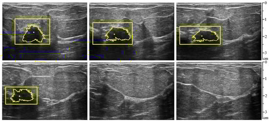 Traditional image segmentation approaches, such as threshold-based methods, boundary analysis, and region growing, complicate the achievement of optimal segmentation results in real time. In response to these challenges, researchers are actively modifying and supplementing existing algorithms. For example, Liu et al. [6] developed a new structure for the fully automated segmentation of lesions in breast ultrasound images, applying morphological filtering and adaptive thresholding using the Otsu method to identify the region of interest (ROI) and the shape of the lesion. Wu et al. [7] focused on evaluating the quality of ultrasound images using deep convolutional networks, demonstrating the effectiveness of their approach in experimental results. Following the initialization of contours, Liu et al. [6] improved the Chan–Vese model for achieving more accurate segmentation.