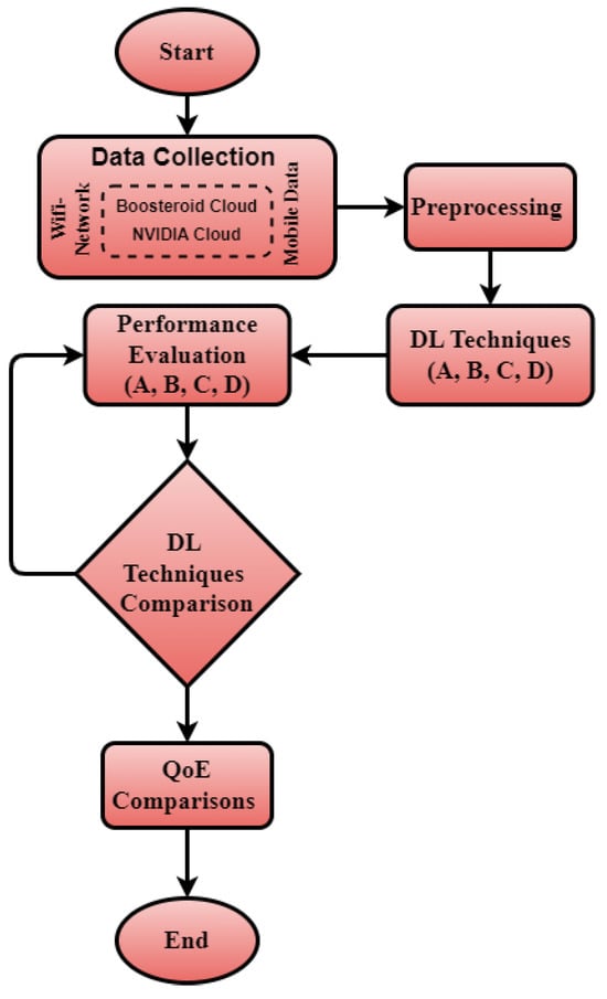 Cloud gaming, also known as gaming on demand or Gaming as a Service (GaaS), represents a modern way of gaming where service providers harness the power of cloud servers to run games and stream high-quality visual content and audio directly to players’ devices [1,2]. With the evolution of cloud gaming, there is no longer a need for expensive personal gaming hardware [3,4]. Players can select and play any game virtually on cloud servers, provided they have a stable internet connection [5,6]. This is particularly beneficial for a new generation of gamers who cannot afford high-end devices, as their local devices may not support high-graphics games [7,8]. Cloud gaming makes it possible to play high-graphics games on local devices [9,10]. One of the key benefits of cloud gaming is its ability to continuously upgrade with the latest technologies, providing users with an immersive gaming experience [11,12]. However, cloud gaming is highly dependent on a good internet connection, as players access games remotely from servers. Low latency is crucial for a responsive and enjoyable user experience [13]. High-bandwidth internet connections, such as fiber-optic internet and stable 5G networks, are required for playing high-graphics games [14]. Cloud gaming data centers need powerful hardware because these servers run games through virtual machines, requiring significant processing power, graphics processing units (GPUs), and ample storage capacity [15]. As the demand for cloud gaming grows, there is a need for advanced servers that can run games smoothly [16,17]. Content Delivery Networks (CDNs) play an essential role in cloud gaming by delivering game data smoothly and reliably from the nearest server to the user’s location [18,19]. An efficient CDN infrastructure is key to providing a lag-free cloud gaming experience, especially for players around the world [20]. In terms of the latest technological advancements, artificial intelligence (AI) is becoming increasingly important for cloud gaming, as it can enhance the overall experience. AI can be used for dynamic bitrate streaming, adjusting video quality based on the user’s internet connection to minimize buffering and improve performance [21,22]. Additionally, AI can personalize gaming settings and difficulty levels based on the player’s behavior, leading to a more tailored gaming experience. Since COVID-19, cloud gaming has become more accessible and in demand, making high-performance gaming available to everyone, regardless of their device specifications or location [23,24]. While cloud gaming offers many advantages, there are still some limitations, such as latency, bandwidth, accessibility, and availability [25]. Cloud infrastructure depends heavily on high-speed internet connections, which can affect the user’s QoE.