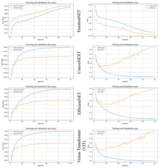 Comparative analysis of training and validation accuracy with their loss: We tested four model techniques on our custom-created dataset. The training loss and validation loss show that the ConvoNEXT, EfficientNET, and ViT model techniques are overfitting in our custom emotion recognition dataset. EmotionNET performs better and balanced accuracy between the training and validation. Although the validation and training accuracy is not much better than ConvoNEXT and EfficientNET, it has the smallest gap between the training and validation loss. This means that the EmotionNET technique performs better on emotion recognition datasets and it has less overfitting as compared to the other model techniques. The other model techniques have high training accuracy but they suffer from increased validation loss which means the model techniques are overfitting. They have limitations on their effectiveness and unseen data. From the graph and data, the EmotionNET model technique shows the best and most balanced performance among the four model techniques because it became balanced between the learning and validation of emotion recognition data.