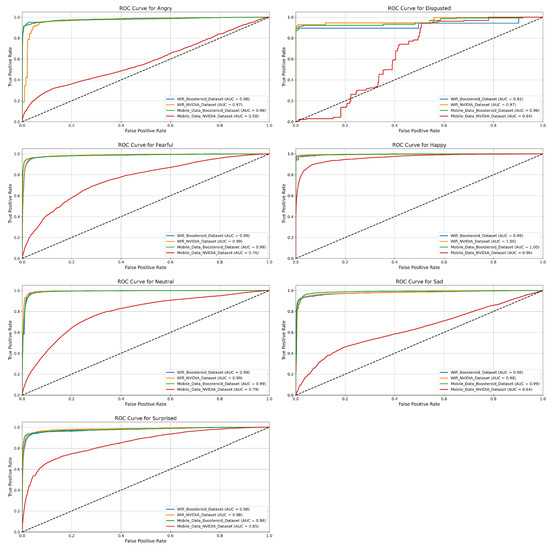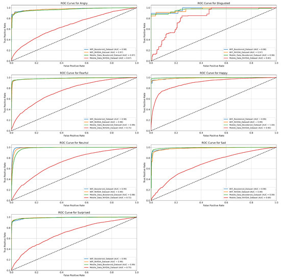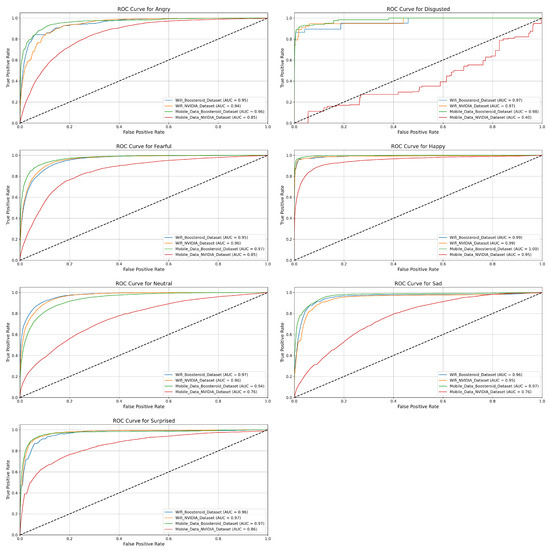 The mobile data Boosteroid dataset displays a solid performance across all emotions. For Angry, Fearful, Sad, Neutral, and Happy, the AUC values range between 0.97 and 1.00, demonstrating near-perfect classification, especially for Happy, where the AUC reaches 1.00. The performance for Disgusted is strong, with an AUC of 0.98, showcasing the model’s ability to handle this challenging emotion well in this dataset. Surprised has a slightly lower AUC of 0.97, but still indicates highly accurate classification with minimal false positives. The mobile data NVIDIA dataset shows mixed results, with a strong classification for Angry (AUC 0.85) and Happy (AUC 0.90). The model performs moderately for Fearful and Neutral, with AUC values of 0.85 and 0.81, respectively, indicating reasonable classification but with some room for improvement. For Disgusted, the model struggles significantly, achieving the lowest AUC at 0.40, suggesting a high rate of misclassification. For Sad and Surprised, the AUC values are 0.76 and 0.86, respectively, showing a moderate performance but significantly lower than the other datasets.