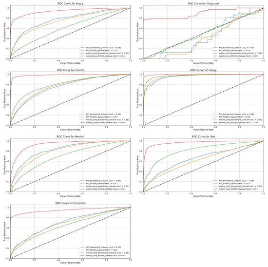 EmotionNET Model Technique ROC: The ROC curves in Figure 4 show the classification performance of the EmotionNET model technique across six emotion categories (Angry, Disgusted, Fearful, Happy, Neutral, Sad, and Surprised) for four datasets: the WiFi (Boosteroid and NVIDIA) datasets, and the mobile data (Boosteroid and NVIDIA) datasets. Each emotion category shows varying levels of classification accuracy, measured by the AUC (area under the curve), where a higher AUC value indicates better performance. For the “Angry” emotion, the EmotionNET technique performs excellently across three datasets, with AUC values close to 0.99, but the mobile data NVIDIA dataset shows much lower performance, with an AUC of 0.78.