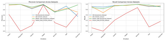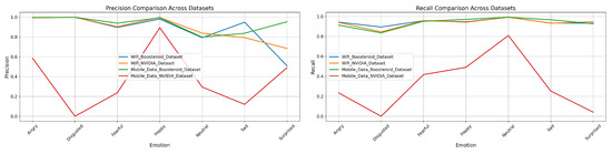 In the mobile data Boosteroid dataset, the “Angry” category has a precision of 0.828677 but a very low recall of 0.054913. The “Fearful” category shows moderate performance with precision and recall values of 0.360429 and 0.546636, respectively. The “Happy” category performs well with a precision of 0.930001 and recall of 0.670511. The “Neutral” category has a high recall (0.909071) but low precision (0.19181). The “Surprised” category performs poorly with a precision of 0.502004 and a recall of 0.038783. The overall accuracy for this dataset is the lowest among the four at 0.339924, with a macro average precision of 0.452749 and recall of 0.368804. The weighted average precision is 0.570115 with a recall of 0.339924. Lastly, the mobile data NVIDIA dataset demonstrates the best overall performance. The “Angry” category achieves a precision of 0.983136 and a recall of 0.715405. The “Fearful” category shows high precision (0.65981) and recall (0.955705), while the “Happy” category has a very strong performance with precision and recall values of 0.983295 and 0.944172, respectively. The “Neutral” category also performs well with a precision of 0.727481 and a recall of 0.96838. The “Surprised” category has a precision of 0.830032 and a recall of 0.775642. The overall accuracy for this dataset is the highest at 0.867067, with a macro average precision of 0.849962 and recall of 0.818839, and a weighted average precision of 0.899558 with a recall of 0.867067. Moreover, Figure 10 shows the graphical representation of the EfficientNET model technique precision and recall performance.