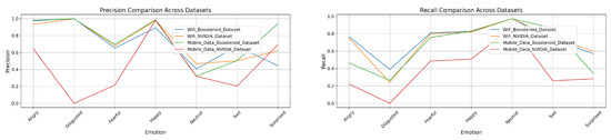 In the mobile data Boosteroid dataset, this technique maintains high precision for the “Angry” category at 0.981519, but recall drops to 0.464809. For the “Disgusted” category, both precision and recall remain high at 0.997433 and 0.26333, respectively, indicating accurate but less sensitive performance. The “Fearful” category has moderate precision at 0.696016 and higher recall at 0.756588. Precision and recall are high in the “Happy” category, at 0.985466 and 0.807506, respectively. The “Neutral” category shows low precision at 0.321687 but high recall at 0.973237, suggesting the model is more sensitive but less accurate in this category. The “Sad” category shows a balanced performance, with precision and recall at 0.540343 and 0.863147, respectively. However, the model struggles with the “Surprised” category, where both precision and recall are low, at 0.349073 and 0.341246, respectively. The overall accuracy for this dataset drops to 0.622849, with a macro average precision of 0.775363 and recall of 0.641776, and a weighted average precision of 0.826255. Finally, in the mobile data NVIDIA dataset, the model’s performance declines further, with precision dropping to 0.645119 and recall to 0.221551 for the “Angry” category. The “Disgusted” category maintains high precision at 0.997433 but very low recall at 0.26333. Precision in the “Fearful” category drops significantly to 0.214528, with a recall of 0.484776. The “Happy” category has high precision at 0.97986 but lower recall at 0.508122. For the “Neutral” category, precision increases to 0.913174, and recall is very high at 0.879558. Both precision and recall are low in the “Sad” category, at 0.214528 and 0.246687, respectively. The “Surprised” category also shows low precision and recall, at 0.154091 and 0.119015, respectively. The overall accuracy for this dataset further decreases to 0.609476, with a macro average precision of 0.436237 and recall of 0.374643, and a weighted average precision of 0.609476. This indicates a significantly lower performance on the mobile data NVIDIA dataset, particularly for certain emotion categories. Furthermore, Figure 9 shows the graphical representation of the ConvoNEXT model technique’s precision and recall.