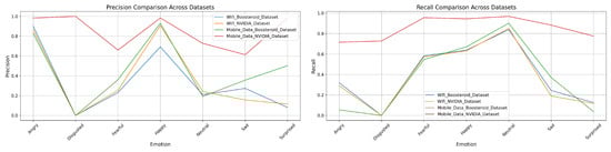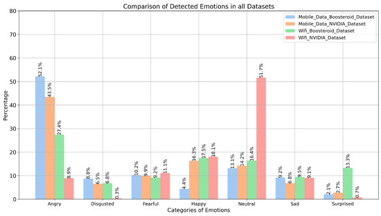 Figure 12 provides a comprehensive comparison of detected emotions across four different datasets: WiFi (Boosteroid and NVIDIA) and mobile data (Boosteroid and NVIDIA). In the mobile data Boosteroid dataset, the “Angry” emotion is the most dominant, with a detection rate of 52.1%, indicating a significant presence of negative emotions. The “Disgusted” emotion is moderately detected at 8.9%, while “Fearful” is also prominent at 10.2%. Positive emotions like “Happy” are under-represented, with only 4.4% detection, making it the least detected emotion in this dataset. The “Neutral” emotion is detected at a moderate rate of 13.1%, reflecting a balanced emotional state, while “Sad” shows a slightly higher detection at 9.2%. The “Surprised” emotion is minimally detected at 2.1%, indicating it plays a minor role in this dataset.