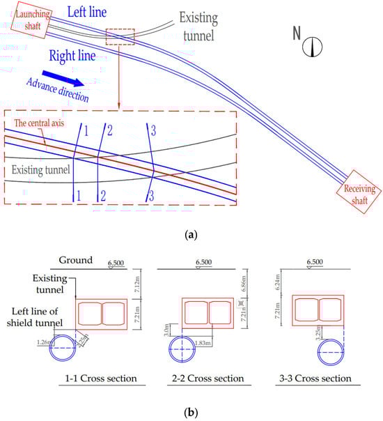 The shield tunnel project discussed in this paper is located in Hangzhou, Zhejiang Province, China. It consists of two parallel tunnels constructed using the earth pressure balance (EPB) shield method. The left tunnel has a length of 848.691 m, with a burial depth ranging from 11.6 to 23.9 m, and a maximum slope of 27.9‰. After the interval section departs from the starting shaft, rings 123 to 180 cross under the existing tunnel. The existing tunnel was constructed using the open-cut method, and the two tunnels intersect at an oblique angle. Figure 1a shows the plan view of the relative positions of the new shield tunnel and the existing tunnel, while Figure 1b illustrates the vertical position relationship between the left tunnel of the new shield tunnel and the existing tunnel. The vertical distance between the new tunnel and the existing tunnel floor ranges from 1.26 m to 3.26 m.