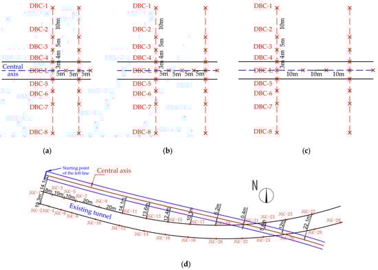 Layout of monitoring points: (a) layout of ground settlement monitoring points for rings 0–25 of the new tunnel; (b) layout of ground settlement monitoring points for rings 25–83 and 600–662 of the new tunnel; (c) layout of ground settlement monitoring points for rings 83–600 of the new tunnel; (d) layout of monitoring points in existing tunnels.