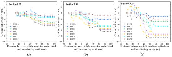 The ground settlement monitoring points for the new shield tunnel are arranged as shown in Figure 2a. For the area between the 0th and 25th rings (approximately 0–30 m) of the left tunnel line, monitoring points are placed every 5 m along the central tunnel axis, labeled as DBC-L. Additionally, a transverse monitoring cross-section is arranged every 10 m perpendicular to the tunnel axis, labeled as DBC1-DBC8. For the section between the 25th and 83rd rings, as well as between the 600th and 662nd rings (approximately 30–100 m and 723–798 m), monitoring points are arranged every 5 m along the tunnel axis, with lateral monitoring sections every 20 m perpendicular to the tunnel axis (Figure 2b). For the section between the 83rd and 600th rings (approximately 100–723 m), monitoring points are placed every 10 m along the tunnel axis, with lateral monitoring sections every 30 m perpendicular to the tunnel axis (Figure 2c). Furthermore, within the range from the 662nd to the 704th rings (approximately 798–848 m), monitoring points are set every 5 m along the tunnel axis, with lateral monitoring sections placed only at the 662nd and 704th rings. The transverse monitoring sections are symmetrically arranged along the tunnel axis, with measurement points located 3 m, 7 m, 12 m, and 22 m perpendicular to the tunnel axis.