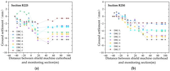 Figure 3 and Figure 4 show that, except for the 25th monitoring section, which is about 30 m from the starting point of the left line, all the other monitoring points in the remaining sections begin monitoring once the shield machine cutterhead is 40–45 m away from the section, and continue until 100 m after the cutterhead passes through the section. Prior to the excavation face reaching the monitoring section, the ground experiences slight settlement or uplift, with a settlement range of approximately ±2 mm. After the excavation face reaches the monitoring section, the ground settlement increases, and tends to stabilize when the excavation face is 40 m to 60 m from the monitoring section. The final ground settlement is within 10 mm, with greater settlement values closer to the tunnel axis.