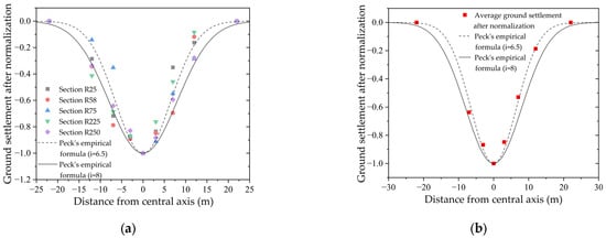 where is the horizontal distance from the tunnel axis, is the ground settlement at position , is the maximum ground settlement above the tunnel axis, is the ground settlement trough width coefficient, is the ground settlement trough width parameter, is the tunnel axis burial depth, and the value of is 6.5 and 8 based on the analysis of the measured data from the Jiangnan section of the Qingchun Road Cross-River Shield Tunnel in Hangzhou by Wei Gang []. Figure 5a shows that the ground settlement value after normalization closely matches the ground settlement trough estimated by Peck’s empirical formula, and the ground settlement data are generally in line with Peck’s empirical formula. Figure 5b compares the average ground settlement value after minimum–maximum normalization with the Peck curve, and the results show that the average ground settlement value has a high degree of overlap with the Peck curve when is taken as 6.5.