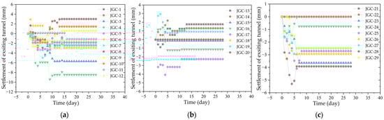 The settlement monitoring point of the existing tunnel begins recording when the excavation face of the left line of the new tunnel reaches the monitoring point of the existing tunnel. Figure 6a shows the longitudinal settlement of the existing tunnel in the section where the existing tunnel and the left line of the new tunnel run nearly parallel. Figure 6b displays the longitudinal settlement of the existing tunnel in the section where the two tunnels are close to each other, and Figure 6c illustrates the longitudinal settlement of the existing tunnel in the undercrossing section. These figures indicate that the existing tunnel is affected by the excavation of the new shield tunnel, resulting in settlement. The settlement of the existing tunnel in the parallel section and the section near the shield tunnel tends to stabilize 10–15 days after the shield excavation face leaves, while the settlement in the undercrossing section stabilizes 6 days after the excavation face departs. This could be because the existing tunnel was preconditioned to accommodate the new shield tunnel. The retaining structure of the shield undercrossing section uses SMW piles, and when the existing tunnel was constructed, the undercrossing section of the shield tunnel was reinforced with mixing piles in advance. As a result, the strength, water-stopping capabilities, uniformity, and overall stability of the stratum were enhanced, leading to smaller settlement during shield excavation and rapid stabilization in the reinforced area [].
