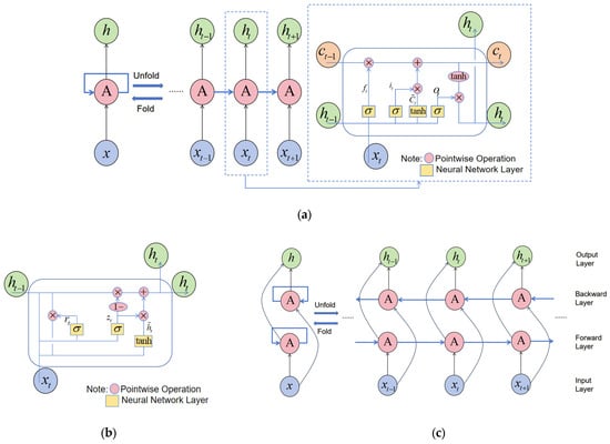 Deep learning networks: (a) LSTM model structure and its unit structure; (b) GRU unit structure; (c) Bi-LSTM model structure.