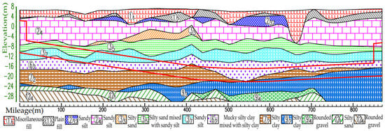 The geological profile of the selected left line section of the shield tunnel is shown in Figure 8. The left line shield mainly traverses sandy silt, silty sand mixed with sandy silt, mucky silty clay mixed with silty clay, and silty clay. Table 1 presents the physical and mechanical parameters of the relevant soil layer, and the parentheses indicate the empirical value. As shown in the table, the physical and mechanical properties of each soil layer are quite different.