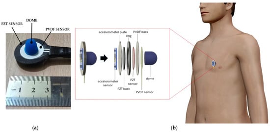 To acquire simultaneous FCG and SCG measurements from the same site on the chest, an ad hoc sensors assembly was designed (see Figure 2). In particular, the PZT sensor was fitted inside a TPU ring with a matching inner diameter, and its back was shielded via a protective TPU back cover. The total thickness of the PZT sensor and its TPU back cover matched the whole TPU ring thickness. The PZT sensor with its TPU enclosure was attached to the back of the PVDF sensor, equipped with the dome-shaped mechanical coupler. The flexible behavior of the PVDF sensor allowed the dome to act simultaneously as a mechanical coupler also for the PZT sensor, as in []. Finally, the accelerometer was attached to the FCG sensors. To this purpose, the accelerometer was first fixed to a TPU plate, which was then attached to the PZT back.