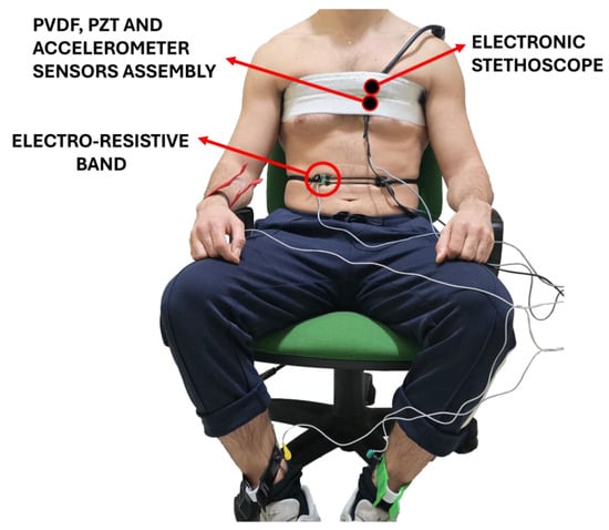 The respiration monitoring technique described by [], previously used in [], was chosen as the reference method to evaluate the performance of the PVDF sensor in respiration monitoring. This involves an electro-resistive band (ERB), which is a stretchable strip made of conductive rubber that exhibits increased electrical resistance when stretched. As a result, it effectively tracks the expansion and contraction of the belly during the inhalation and exhalation phases. The ERB was secured around subjects’ torsos at the abdomen. An example of a subject equipped with the measurement setup is depicted in Figure 3.