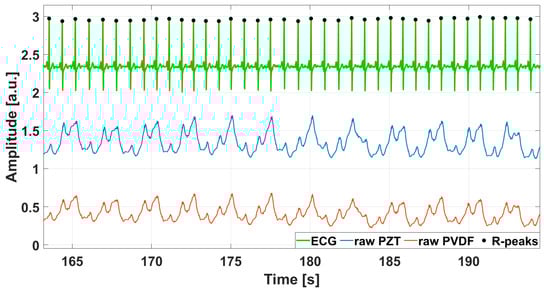 Excerpt of FCG sensors signals acquired from subject #3, displayed together with the reference ECG signal. Raw signals from PZT sensor and PVDF sensor were depicted with blue and red lines, respectively. Black dots mark the R-peaks detected on the ECG signal.