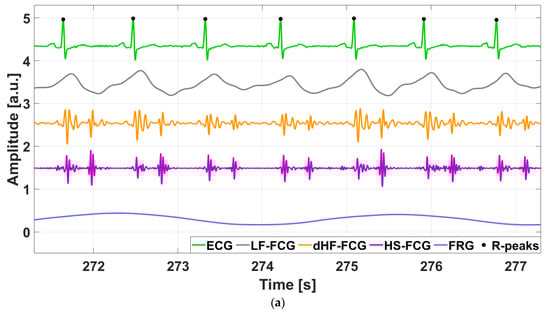 Forcecardiography (FCG) has recently emerged as a new technique for cardiac monitoring. It involves recording the pressure exerted by heart contractions onto the chest by means of force sensors []. The use of force sensors with a wide frequency response allows measurement of the large, slowly varying forces exerted by expansions and contractions of the ribcage during respiration, as well as the weak forces induced on the chest wall by the mechanical activity of the heart [,]. Indeed, the raw signal obtained from an FCG sensor contains a respiratory component, referred to as Forcerespirogram (FRG), a low-frequency infrasonic component (LF-FCG) related to movements of heart walls and blood volume changes during emptying and filling of heart chambers, a high-frequency infrasonic component (HF-FCG) corresponding to heart valves vibrations, and an audible component (HS-FCG) corresponding to heart sounds. FCG allows capturing all these components simultaneously from a single site on the chest, thus offering the ability to perform a multimodal cardio-respiratory monitoring for continuous long-term surveillance of healthy and pathological subjects [].