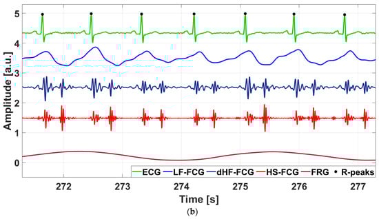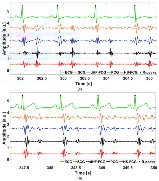 Excerpts of ECG, SCG, PCG, and FCG signals acquired simultaneously from two subjects involved in the experiment: (a) ECG, SCG, PCG, dHF-FCG, and HS-FCG of subject #3; (b) ECG, SCG, PCG, dHF-FCG, and HS-FCG of subject #32.