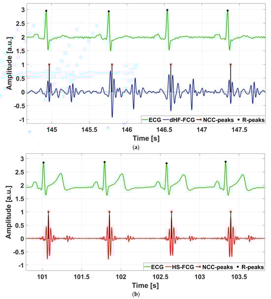 Heartbeats detection on dHF-FCG and HS-FCG, compared with the reference ECG signal: (a) heartbeats localization on dHF-FCG from subject #3; (b) heartbeats localization on HS-FCG from subject #32.