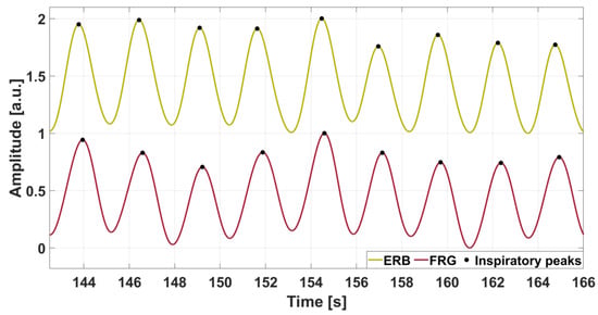 Comparison between the FRG extracted from the PVDF sensor signal from subject #3 and the reference ERB signal. The respiratory acts are marked with black dots.