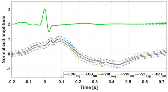 Figure 8 shows an example of ECG-triggered ensemble averages (synchronized with R-peaks and computed on about 230 heartbeats) of the FCG signals and the related ECG signal from subject #3, depicted as continuous lines. Their standard deviation (SD) ranges, which provide a measure of morphological variability, are also shown as dashed lines. It is possible to observe that the PVDF sensor signal and the PZT sensor signal exhibit very narrow SD ranges. This minimal variability in the shape of the FCG signal among multiple heartbeats demonstrates that also the PVDF sensor is capable of accurate and reproducible FCG measurements.