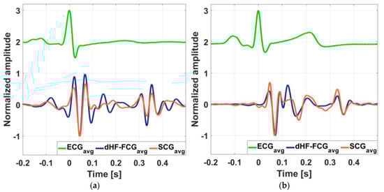 Comparison of aligned ECG-triggered ensemble averages of SCG (orange line) and dHF-FCG (dark blue line) signals, along with the ensemble average of the ECG (green line): (a) aligned ensemble averages of SCG and dHF-FCG signals from subject #3; (b) aligned ensemble averages of SCG and dHF-FCG signals from subject #32.