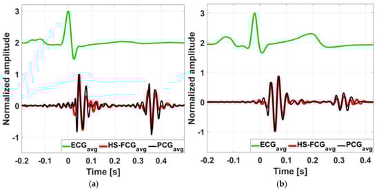 Comparison of aligned ECG-triggered ensemble averages of PCG (black line) and HS-FCG (red line) signals, along with the ensemble average of the ECG (green line): (a) aligned ensemble averages of PCG and HS-FCG signals from subject #3; (b) aligned ensemble averages of PCG and HS-FCG signals from subject #32.