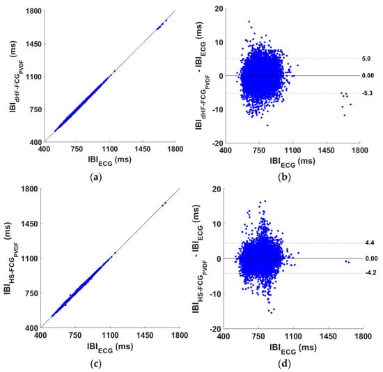Statistical analyses on the inter-beat intervals (IBIs) obtained from dHF-FCG, HS-FCG (extracted from the PVDF sensor signal), and reference ECG signals: (a) results of regression and correlation analysis achieved from dHF-FCG signal; (b) results of Bland–Altman analysis achieved from dHF-FCG signal; (c) results of regression and correlation analysis achieved from HS-FCG signal; (d) results of Bland–Altman analysis achieved from HS-FCG signal.