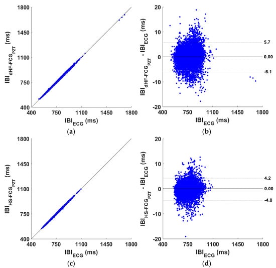 Statistical analyses on the inter-beat intervals (IBIs) obtained from dHF-FCG, HS-FCG (extracted from the PZT sensor signal) and reference ECG signals: (a) results of regression and correlation analysis achieved from dHF-FCG signal; (b) results of Bland–Altman analysis achieved from dHF-FCG signal; (c) results of regression and correlation analysis achieved from HS-FCG signal; (d) results of Bland–Altman analysis achieved from HS-FCG signal.