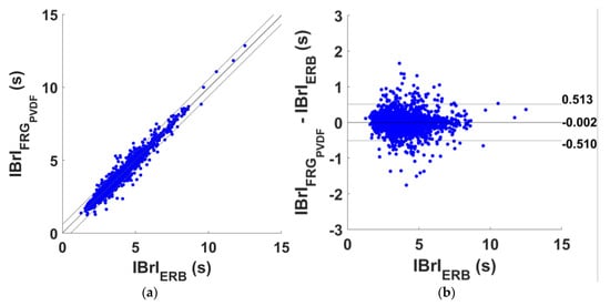 Statistical analyses on the inter-breath intervals (IBrIs) obtained from ERB and FRG signal provided by PVDF sensor signals: (a) results of regression and correlation analyses; (b) results of Bland–Altman analysis.