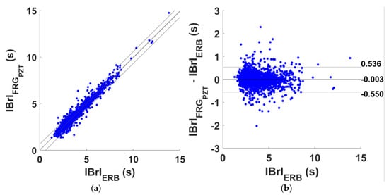 Statistical analyses on the inter-breath intervals (IBrIs) obtained from ERB and FRG signal provided by PZT sensor signals: (a) results of regression and correlation analyses; (b) results of Bland–Altman analysis.