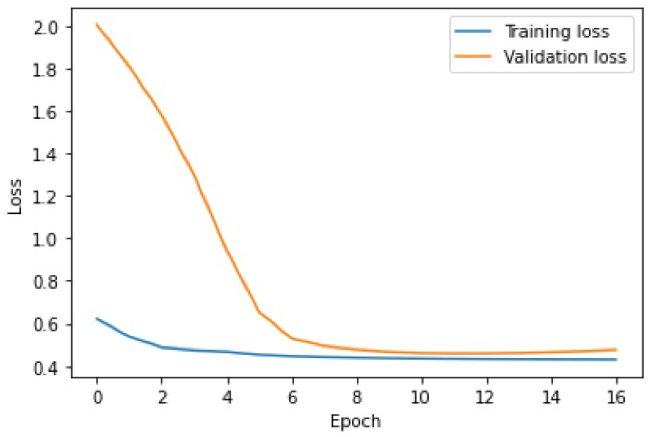 In the first step, the model applies a one-dimensional convolutional layer and a pooling layer. This makes it possible to obtain a compressed representation of the input with higher-level functions. Then, this representation is passed on to the next layer, such as the LSTM layer, which is more capable of representing the sequence, preparing it for further processing. After the LSTM layer, the dropout layer is used, which allows for better regularization to reduce the risk of overtraining. The model’s construction is as follows. The input data are a three-dimensional vector (None, 5, 1), where 5 is the time step and 1 represents the time step input dimension features. At first, data are entered into the one-dimensional convolutional layer to extract features and obtain a three-dimensional output vector (None, 5, 256), where 256 is the number of filters (kernels). In the next step, the vector enters the pooling layer. This is a three-dimensional vector (None, 1, 256). The next part of the model is the input of the previously obtained vector to the LSTM layer, where the training takes place. The output data (None, 64) undergoes regularization. Here, another fully connected layer is applied to obtain the output value.