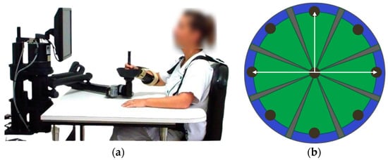 All participants underwent an upper limb rehabilitation program involving robotic therapy and occupational therapy. In conventional occupational therapy, interventions involved passive muscle stretches performed by a clinician, active reaching movements and specific grasping and releasing tasks performed by the participant. These exercises were aimed at improving motor function, coordination and muscle activation. The frequency and intensity of the sessions were tailored to each patient’s abilities and progression. In robotic therapy, participants performed many repeated movements with the paretic arm using an end-effector type robotic device (Figure 1a). This involved performing goal-directed shoulder and elbow movements in the horizontal plane while holding the handle of the robotic arm with the distal part of the upper limb. The circular pointing task consisted of repeated movements from a rest position (center) towards eight visual targets located around a circle (Figure 1b). The distance to travel between the center and each target could be chosen from three options (3, 9 or 14 cm, i.e., the maximum distance).