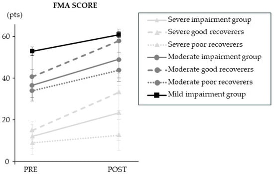 The clinical outcomes are presented in Figure 2 and Table 4. Overall, the results showed a statistically significant mean increase in total FMA score of 11 (10) points after the combined program (p = 4.12 × 10−8). The stratified results showed that FMA scores changed from pre- to post-intervention in participants with severe (+11 (12) points; p = 6.90 × 10−5) and moderate (+13 (6) points; p = 7.81 × 10−3) impairment. Improvement in poor and good recoverers only differed significantly in the severely impaired group (p = 4.92 × 10−4); poor recoverers improved by 4 (4) points and good recoverers improved by 18 (12) points. FMA score did not improve after the combined program in the mild impairment group (+8 (2) points; NS).