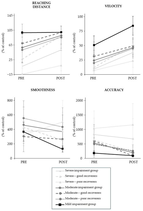 The stratified results showed that reaching distance (+44 (51) %; p = 3.76 × 10−4, effect size = 0.5) and velocity (+28 (23) %, p = 6.09 × 10−6, effect size r = 0.6) improved in participants with severe impairment, and velocity (+22 (20) %; p = 1.53 × 10−2, effect size r = 0.5) and accuracy (−336 (360) %, p = 3.37 × 10−2, effect size r = 0.6) improved in those with moderate impairment. In the mild impairment group, velocity (34 (20) %, p = 1.80 × 10−2, effect size r = 0.6), accuracy (−89 (44) %, p = 1.08 × 10−2, effect size r = 0.6) and smoothness (−240 (119) %, p = 1.08 × 10−2, effect size r = 0.6) improved.