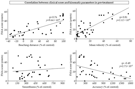 The correlation results are shown in Figure 4. Pre-treatment, FMA scores were strongly correlated with reaching distance (Spearman’s rho = 0.76; p = 9.64 × 10−8) and mean velocity (Spearman’s rho = 0.81; p = 2.12 × 10−9) and moderately negatively correlated with accuracy (Spearman’s rho = −0.49; p = 2.71 × 10−3).