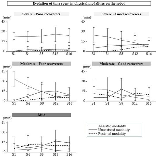 The patterns of use of the physical modalities during training sessions with the robot are shown in Figure 5. The two-way repeated measures ANOVA indicated a significant modality x session interaction only in good recoverers with severe impairment (p = 1.56 × 10−6, ηp2 = 0.4). The time spent in the assisted modality decreased over time for these participants (Session 1 vs. Session 16, p = 2.11 × 10−4; Session 4 vs. Session 12, p = 2.98 × 10−3; Session 4 vs. Session 16, p = 2.23 × 10−4).