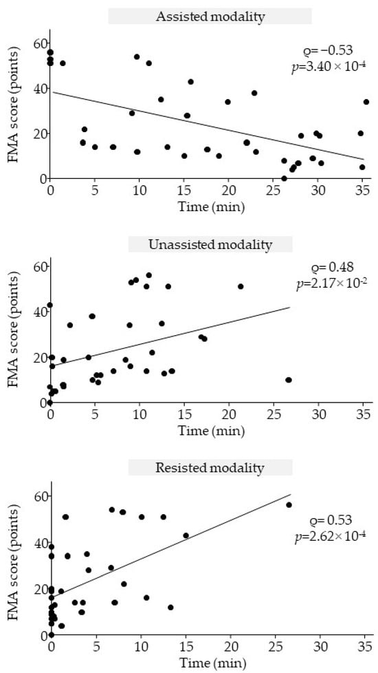 The correlation results are shown in Figure 6. Initial FMA scores were moderately negatively correlated with mean time spent in assisted modality (Spearman’s rho = −0.53; p = 3.40 × 10−4) and moderately correlated with mean time spent in unassisted modality (Spearman’s rho = 0.48; p = 2.17 × 10−2) and with mean time spent in resisted modality (Spearman’s rho = 0.53; p = 2.62 × 10−4).