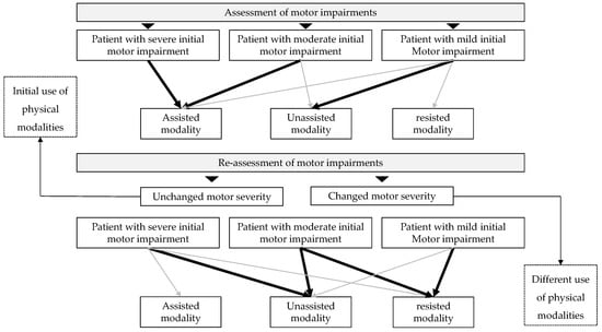 Decision tree for tailoring physical modalities in robotic therapy. In the decision tree, thick black arrows indicate high usage, while thin gray arrows indicate low usage.