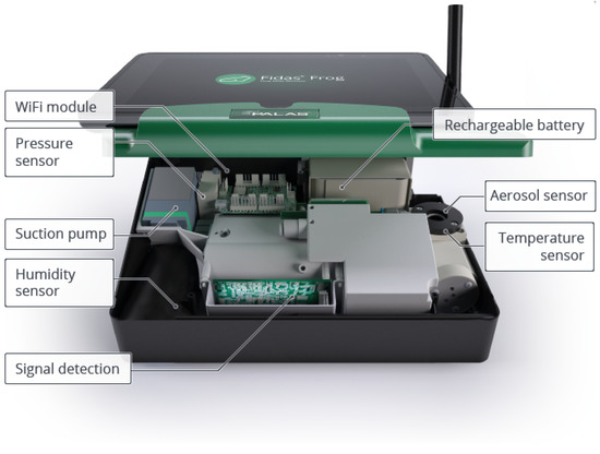 The Palas Fidas Frog [17,18] (Figure 1) is an optical particle counter that is more affordable than Federal Equivalent Method (FEM) devices, which still provides precise measurements of particulate matter (PM). It is portable, battery-operated, and the smallest model among the Fidas aerosol monitors. The Fidas Frog measures the following parameters: PM1.0, PM2.5, PM4.0, PM10.0, Total PM Concentration, and Particle Count Density. It employs the well-established single-particle optical light scattering method for measurement.