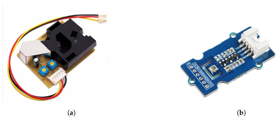 Sensors used in the low-cost LoRaWAN air quality monitor. (a) PPD42NS—The PM sensor used in the LoRaWAN-based air quality monitor which measures particulate matter with sizes larger than 1 m and 2.5 m [20]. (b) BME280—The climate sensor used in the LoRaWAN-based air quality monitor which measures air temperature, atmospheric pressure, and relative humidity [21,22].
