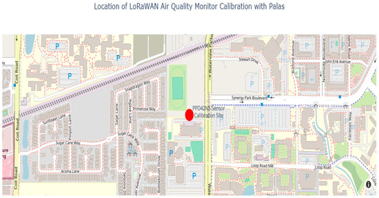 Calibration site for LoRaWAN air quality monitor deployment (indicated by the red marker and labeled in blue).