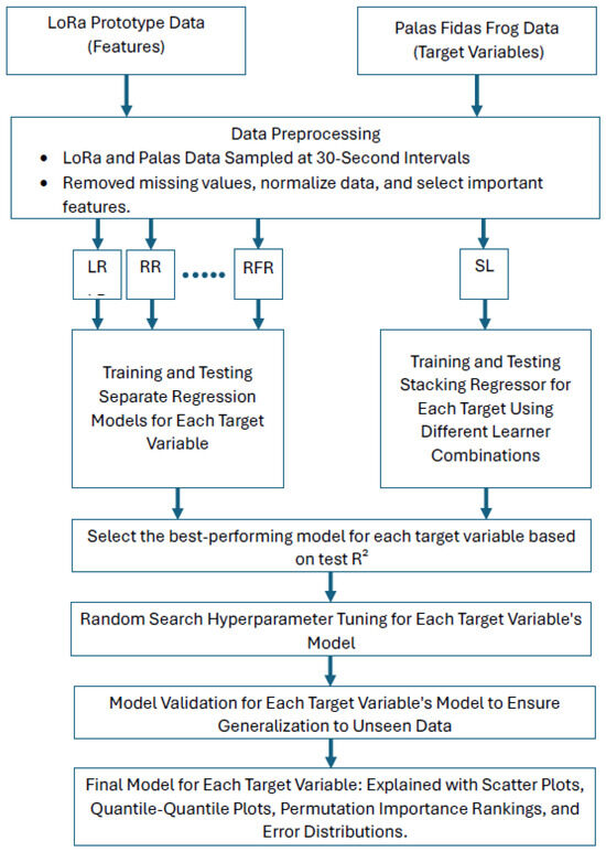 Overview of the calibration workflow using machine learning models. The process starts with LoRa prototype sensor data (features) and Palas Fidas Frog sensor data (target variables). Data preprocessing includes resampling at 30-s intervals, handling missing values, normalizing data, and selecting relevant features. Various regression models are trained separately for each target variable, along with a Stacking Regressor (SL) that combines different learner combinations. The best-performing model for each target variable is determined based on test R2, followed by hyperparameter tuning using random search. The final models undergo validation to ensure generalization to unseen data and are evaluated through scatter plots, quantile–quantile plots, permutation importance rankings, and error distributions.