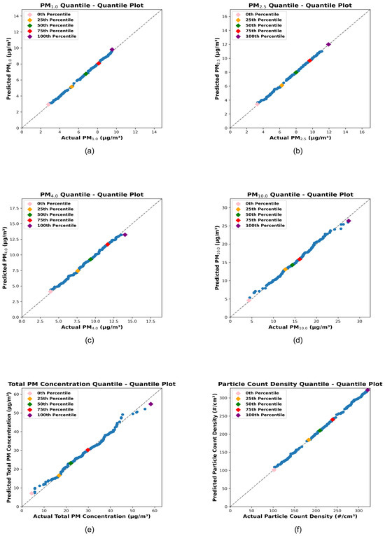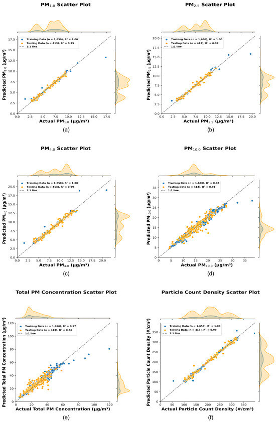 Scatter plots (a–f) illustrate the performance of hyperparameter-optimized stacking models for PM1.0, PM2.5, PM4.0, PM10, Total PM Concentration, and Particle Count Density, respectively. The blue and orange dots represent the training and testing datasets. Marginal distributions of the actual data (top) and predicted data (right) provide additional insights into the model’s performance. The legends include the train-test split count and R2 values, quantifying the accuracy and overall effectiveness of the predictions.
