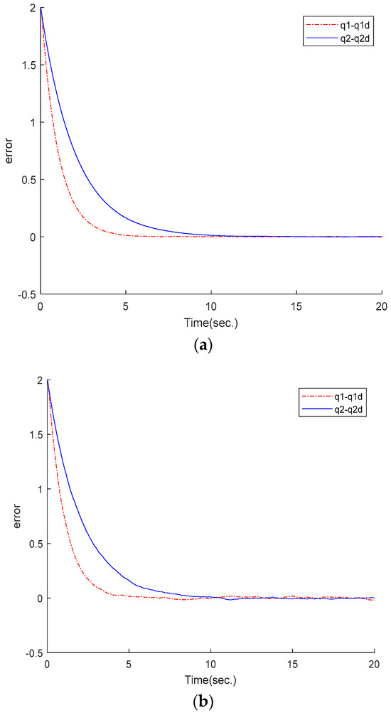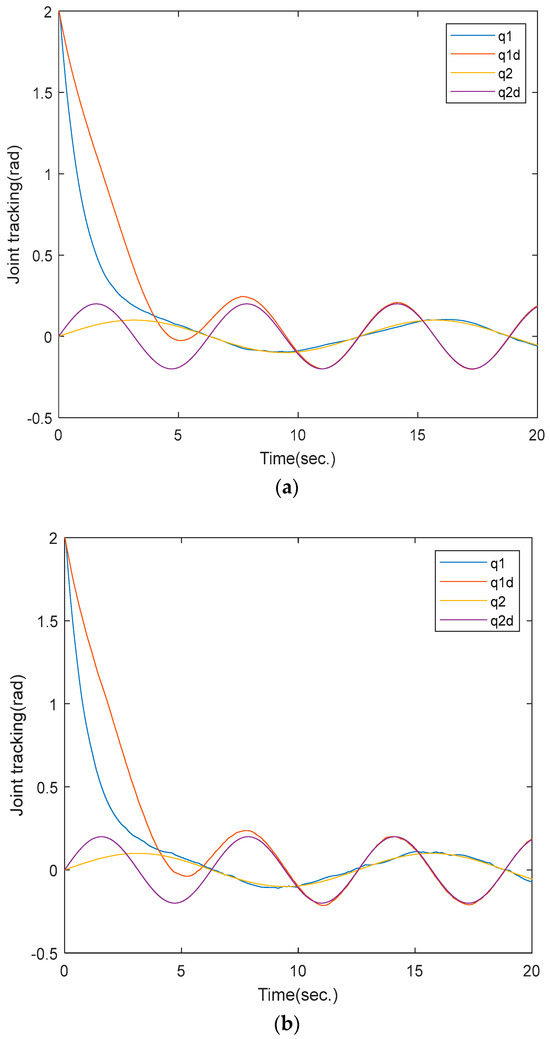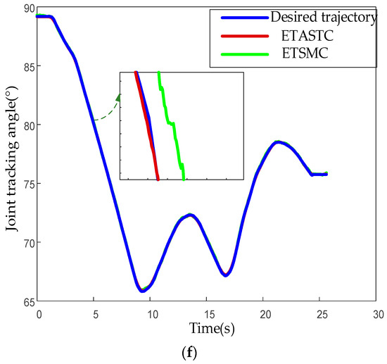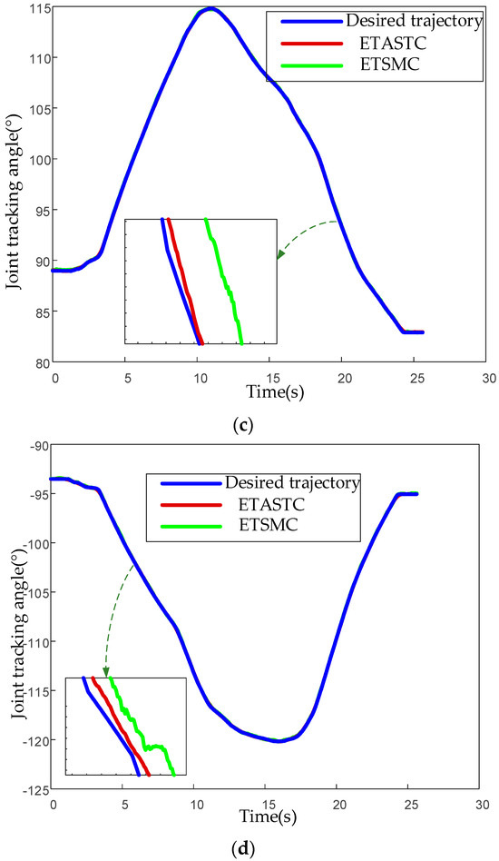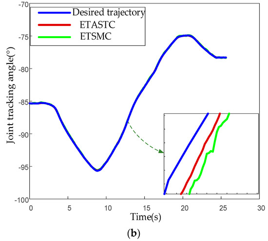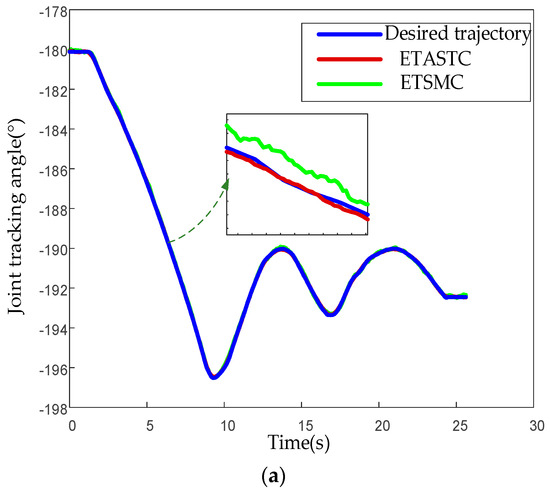 The actual and desired joint angles of the robot manipulator are shown in Figure 3. As can be seen from Figure 3a, the proposed method can quickly track the desired joint angles. The simulation results of the ETSMC scheme are shown in Figure 3b. It can be seen that the ETSMC can achieve a similar tracking accuracy.