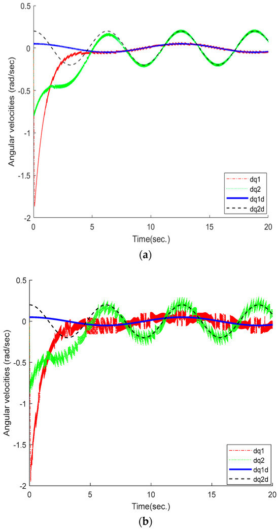 Actual (, ) and desired (, ) velocities of the robot manipulator. (a) proposed method; (b) ETSMC scheme.