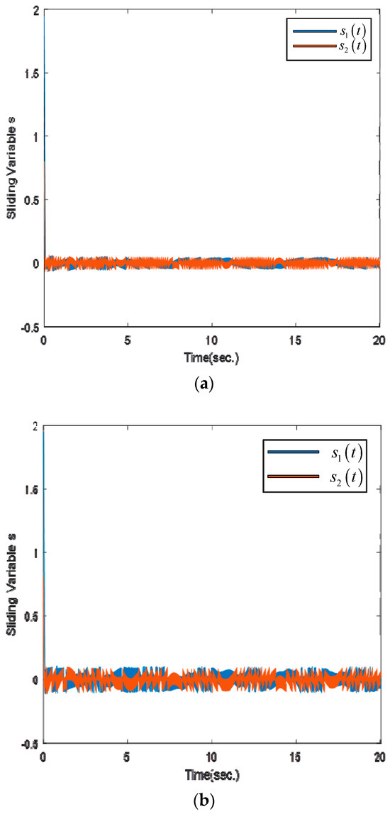 In Figure 6a, the evolution of the sliding trajectories demonstrates that the sliding variable can reach the sliding manifold in a finite time. However, the finite time of Figure 6b demonstrates that the sliding variable that reaches the sliding manifold is longer than the proposed control scheme.
