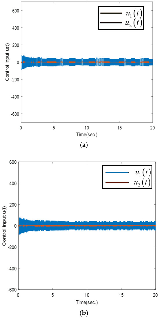 The control inputs via numerical simulation: (a) proposed method; (b) ETSMC scheme.