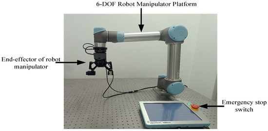 To further prove the effectiveness of the proposed controller, experiments were carried out on the UR5 robot manipulator. The layout of the experimental system is demonstrated in Figure 9. The platform mainly consists of a UR5 robot manipulator and a network communication module, aiming to achieve precise robot manipulator tracking control. UR5 is a six-degrees-of-freedom collaborative robot manipulator produced by Universal Robots, which is widely used in automated experiments, industrial operations and other fields. The robot manipulator has high flexibility and precise motion-control capabilities, making it suitable for visual servoing and other advanced control tasks. Each joint of the UR5 robot manipulator is equipped with a high-precision motor and encoder, ensuring precise positioning and motion control. The UR5 robot manipulator uses the Universal Robots controller and supports multiple interfaces, such as Ethernet, RS-232 and RS-485, and can be seamlessly connected to external computers or other devices. The maximum working radius is 850 mm, which is suitable for smaller tasks. The UR5 has a repeatability of ±0.1 mm and a maximum load of 5 kg, which can meet the needs of high-precision control.